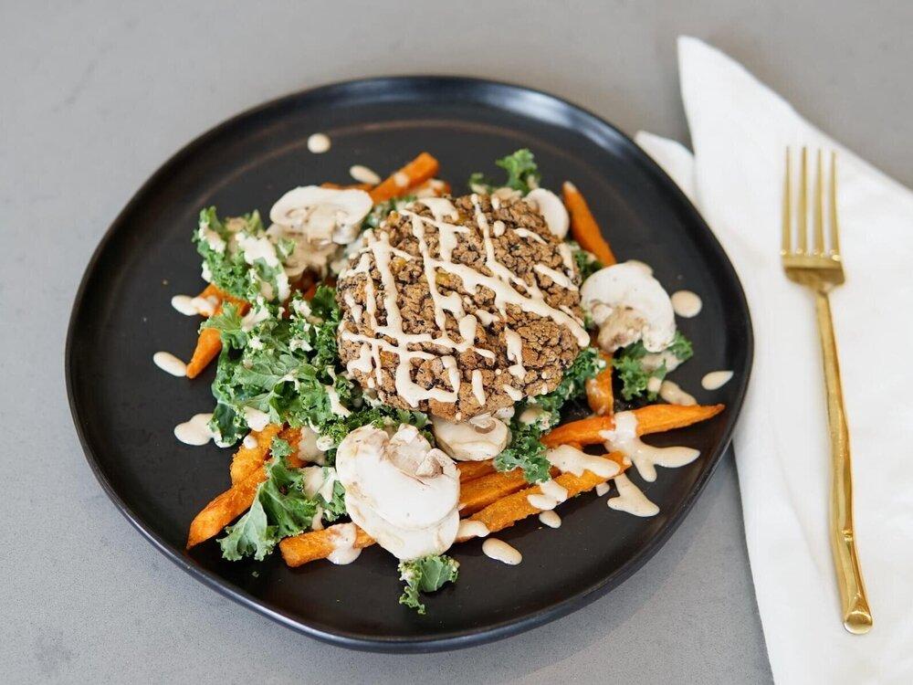 BLACK BEANS, KALE, SWEET POTATO, MUSHROOMS, CORN, VEGAN MAYONNAISE, VEGETABLE STOCK, GRAPESEED OIL, GARLIC, COOKED, ONION POWDER, RICE FLOUR, APPLE CIDER VINEGAR, DILL, BLACK PEPPER.