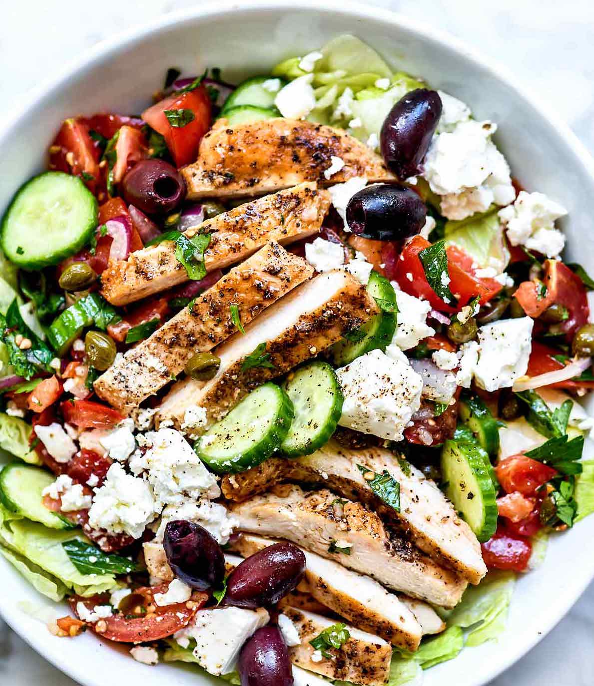 CHICKEN, SPRING MIX (ARUGULA, OAK, ROMAINE, SPINACH, FRISÉE), ROASTED RED PEPPER, FETA, OLIVES, MUSTARD, APPLE CIDER VINEGAR, OLIVE OIL, NONFAT GREEK YOGURT, PEPPERONCINI, BLACK PEPPER, SALT, ITALIAN SEASONING (MARJORAM, THYME, ROSEMARY, SAVORY, SAGE, OREGANO, BASIL).