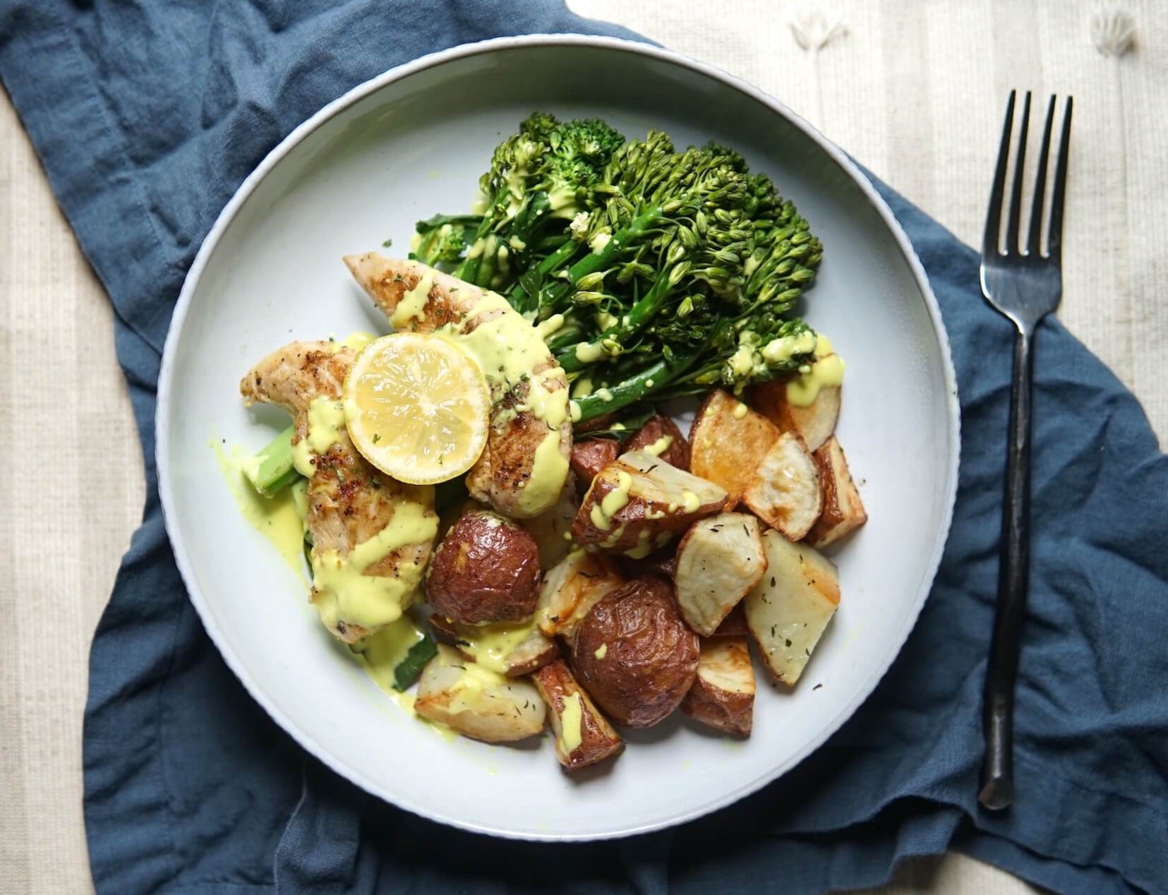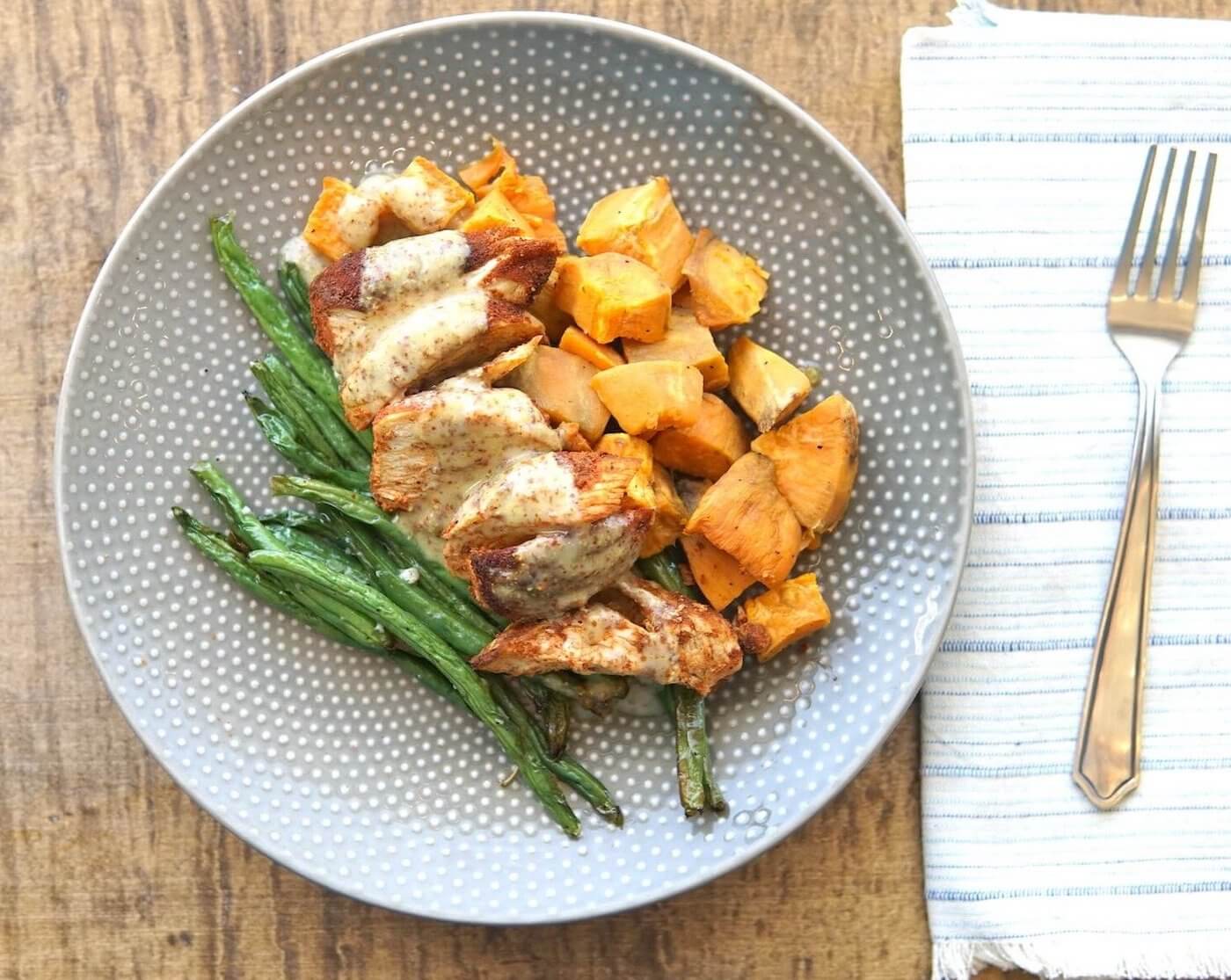 SWEET POTATO, FROZEN, COOKED, BAKED, WITH SALT, CHICKEN, BEANS, SNAP, GREEN, COOKED, BOILED, DRAINED, WITH SALT, MUSTARD, HONEY, OLIVE OIL, WORCESTERSHIRE SAUCE, APPLE CIDER VINEGAR.