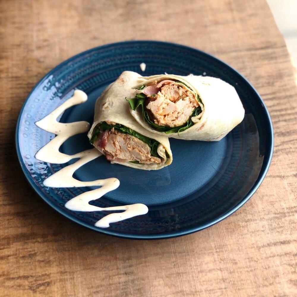 CHICKEN, TORTILLA WRAP,, TOMATOES, RANCH DRESSING, SPINACH, BACON, RED ONION, BUFFALO SAUCE .
