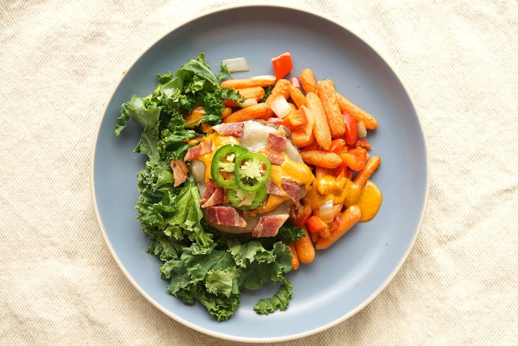GROUND BEEF, CARROTS, MAYONNAISE, ONIONS, RED PEPPERS, VEGETABLE STOCK, CHIPOTLE PEPPER, KALE, GOUDA CHEESE, DILL, JALAPENOS, BACON.