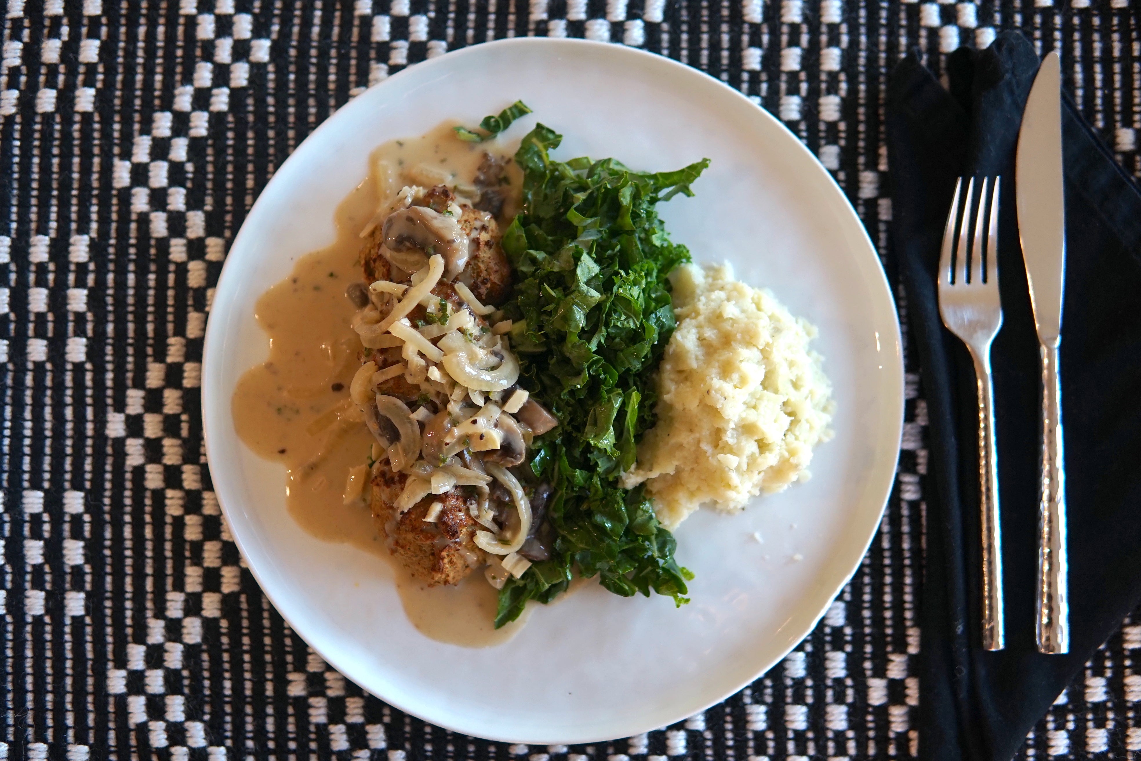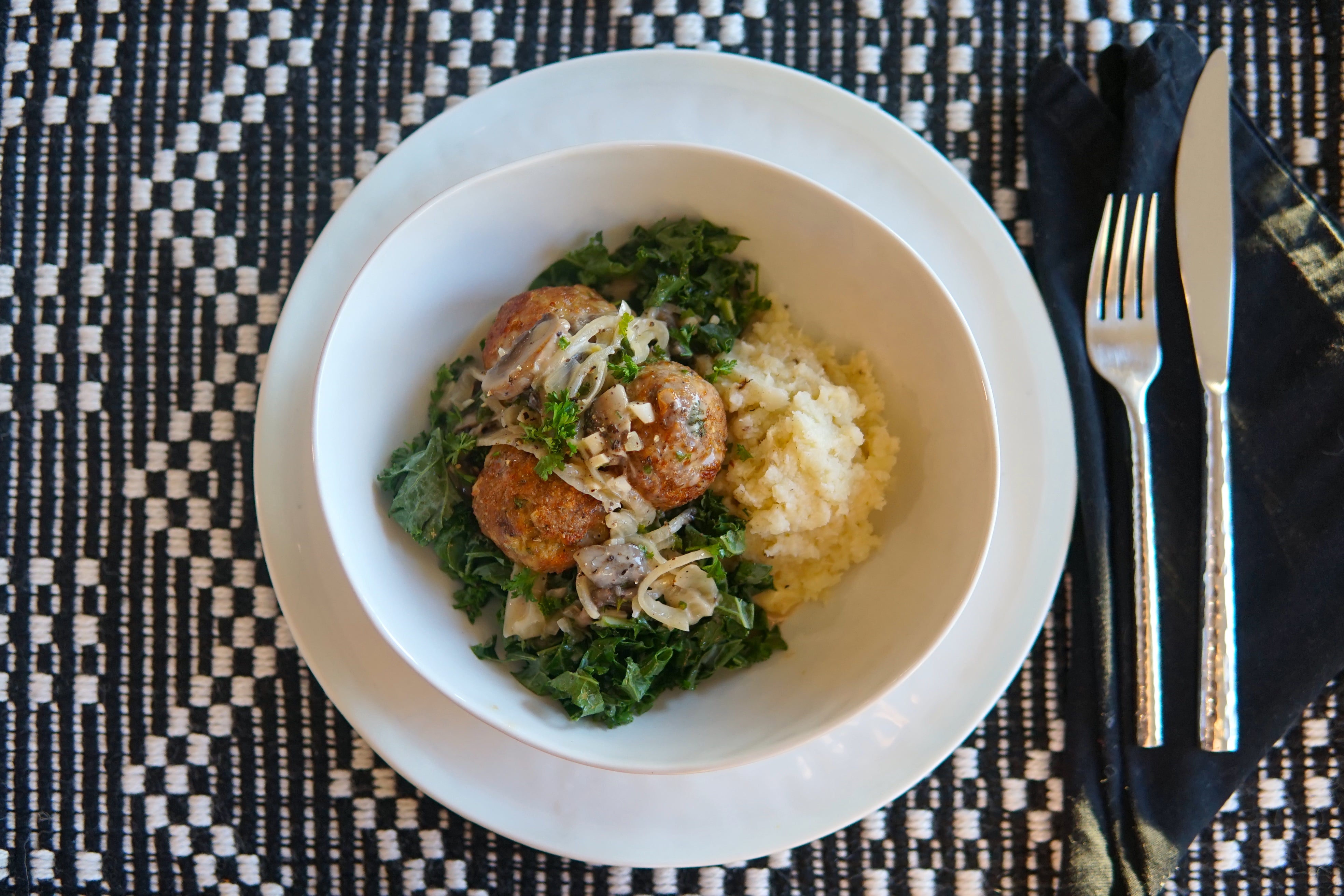 CAULIFLOWER PUREE, ANGUS BEEF, GROUND, PORK, FRESH, GROUND, COOKED, COCONUT MILK (COCONUT EXTRACT, WATER, CITRIC ACID (AS ANTIOXIDANT), SODIUM METABISULFITE (AS PRESERVATIVE)), KALE, SOUP, SWANSON CHICKEN BROTH 99% FAT FREE, WHITE MUSHROOM, EGG WHITES, GHEE CLARIFIED BUTTER, ONION, OLIVE OIL, RICOTTA CHEESE (WHEY, PASTEURIZED MILK, VINEGAR, SALT, XANTHAN GUM), ROMANO CHEESE (PASTEURIZED COW'S MILK, CHEESE CULTURE, SALT, ENZYMES), ARROWROOT FLOUR, WHITE PEPPER, BLACK PEPPER, SALT, RICE FLOUR, GARLIC POWDER, PARSLEY, BROWN SUGAR.