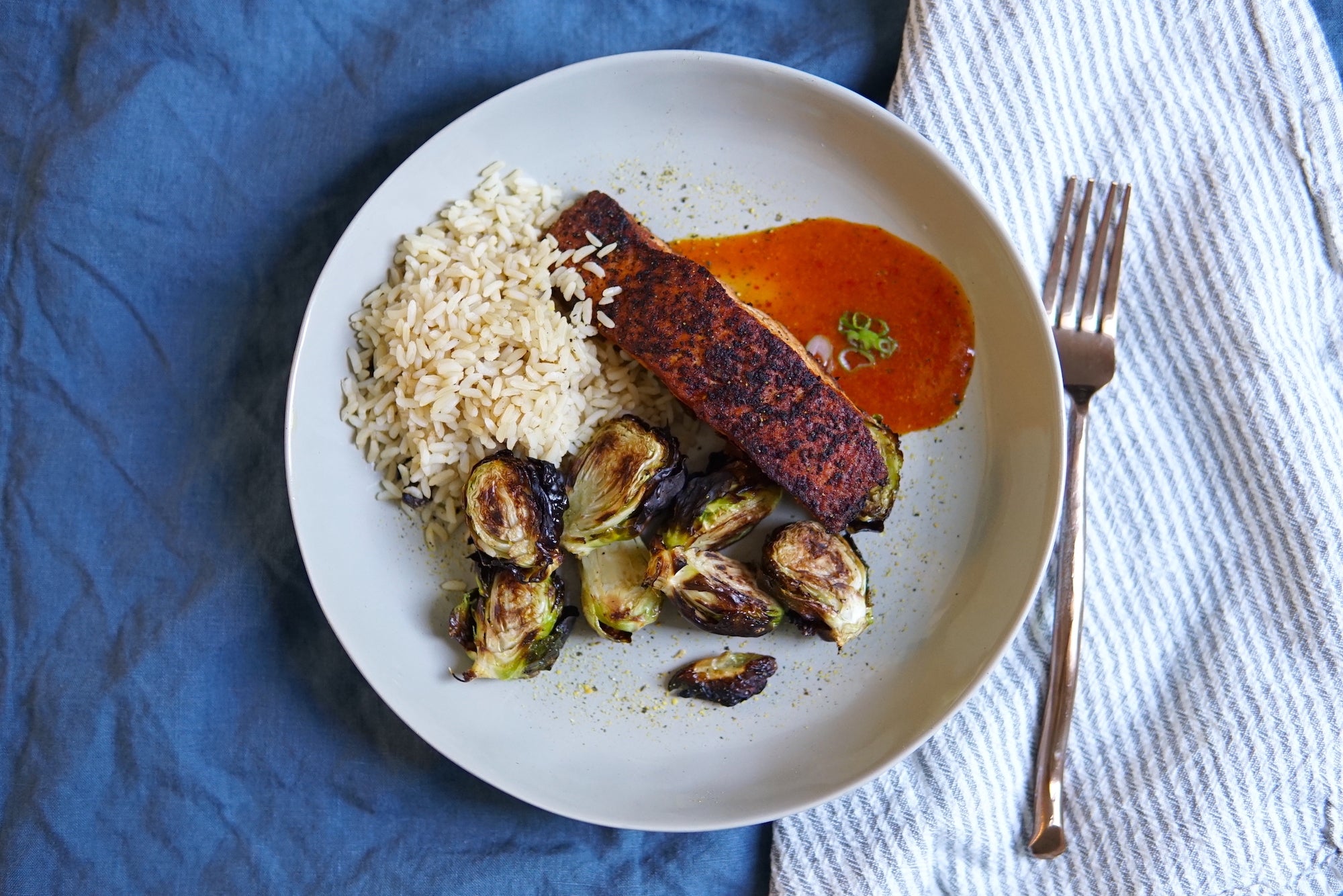 SALMON, BRUSSELS SPROUTS, CHILI PASTE (SUGAR, SOYBEAN OIL, SHALLOT, TAMARIND, RED CHILI PEPPER, FISH SAUCE (ANCHOVY EXTRACT, SALT, SUGAR), SHRIMP, GARLIC, PEANUT, WATER), SRIRACHA (CHILI, SUGAR, SALT, GARLIC, DISTILLED VINEGAR, POTASSIUM SORBATE AND SODIUM BISULFITE, XANTHAN GUM), PINEAPPLE, CILANTRO, LEMON PEPPER SEASONING, SCALLIONS, BLACK PEPPER, SALT.